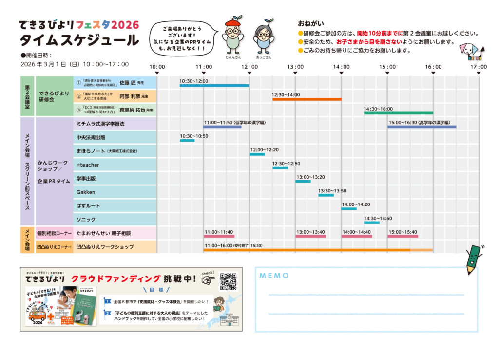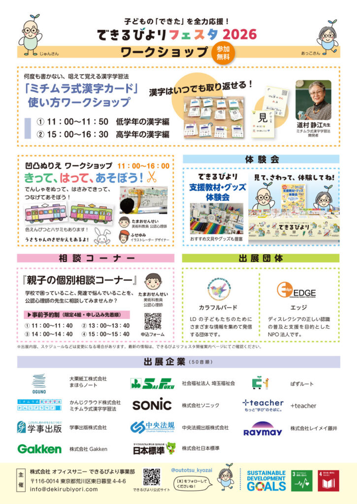 通常の「できるびより支援教材・グッズ体験会」と同様に、読み書きが苦手な子でも取り組みやすい教材や、不器用な子でも使いやすい文房具や道具を、見てさわって試せるコーナーを展開します。