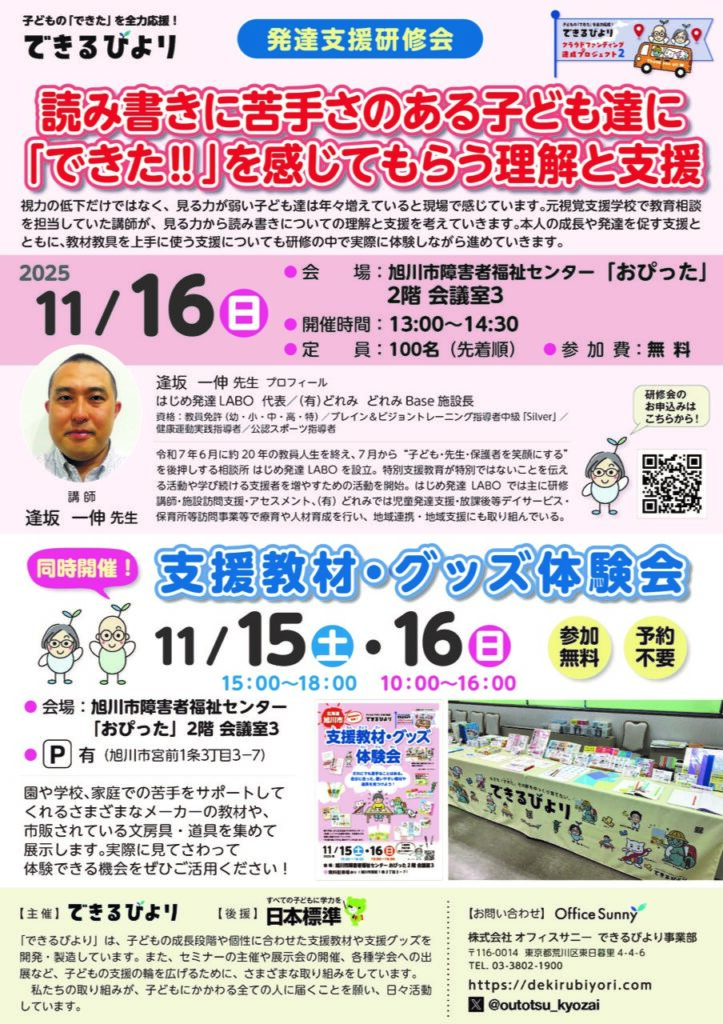 ≪できるびよりクラウドファンディングプロジェクト2》11月16日(日)に「北海道旭川市」で【できるびより支援教材・グッズ体験会】と【発達支援研修会】を開催します。