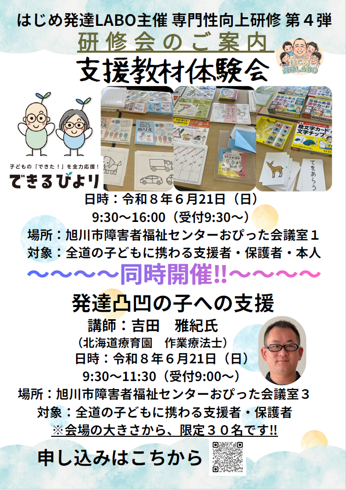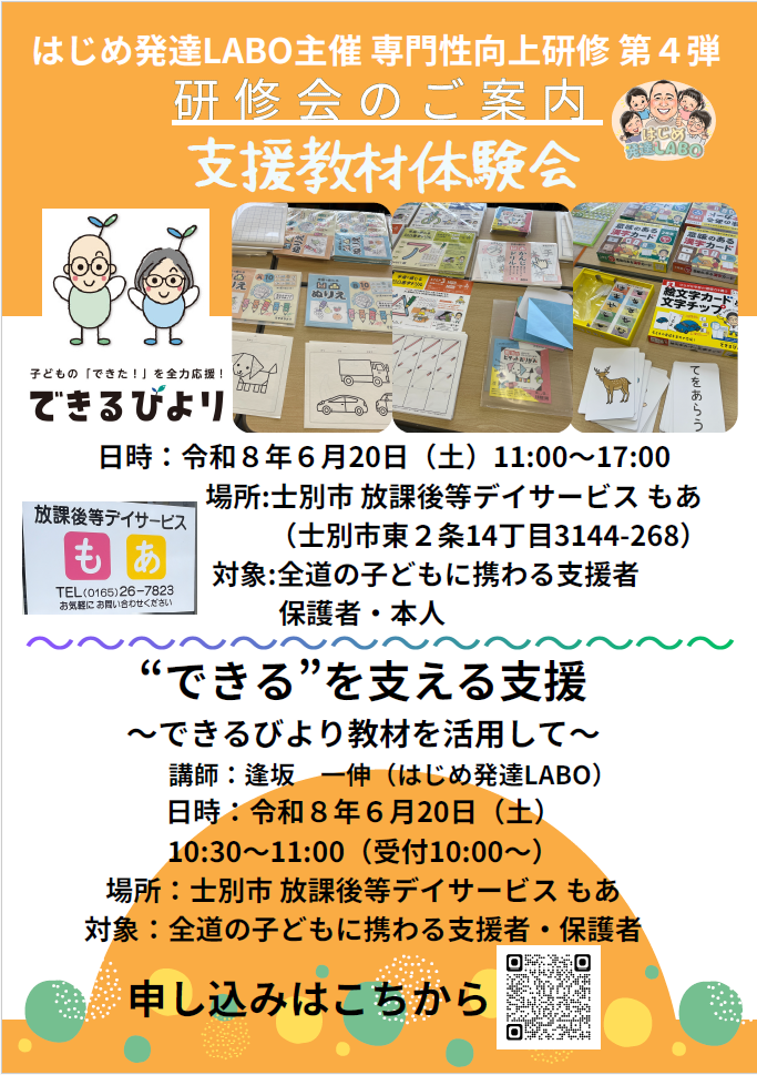 【北海道士別市・旭川市開催】6月20日(土)・21日(日)に、放課後等デイサービスもあ/旭川市障がい者福祉センターおぴったにて、<できるびより支援教材・グッズ体験会>を開催します。