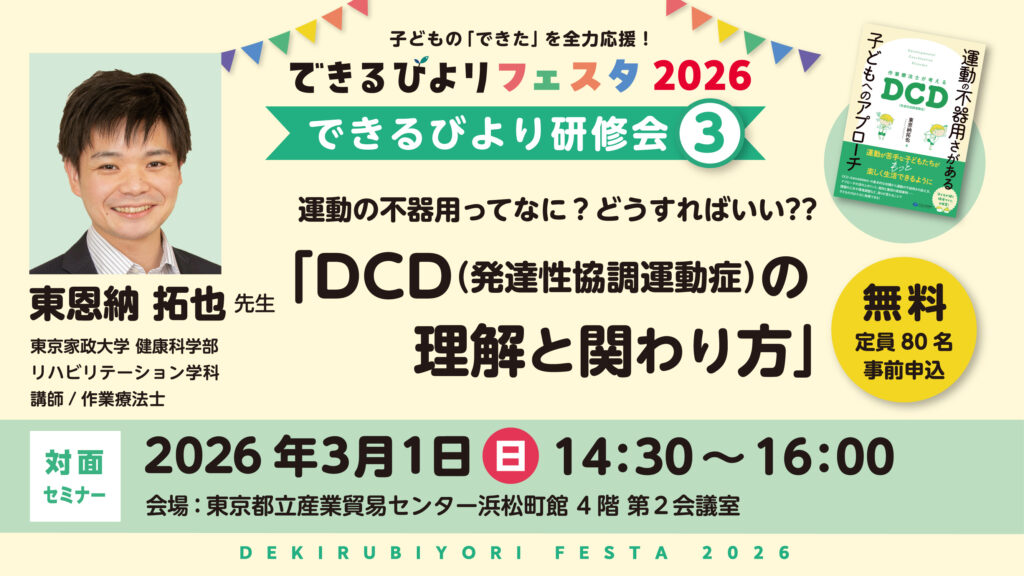 3月1日(日)に開催予定の【できるびよりフェスタ2026】では、発達支援に関する研修会を3つ開催します。各研修会への申し込み受付を開始しました。